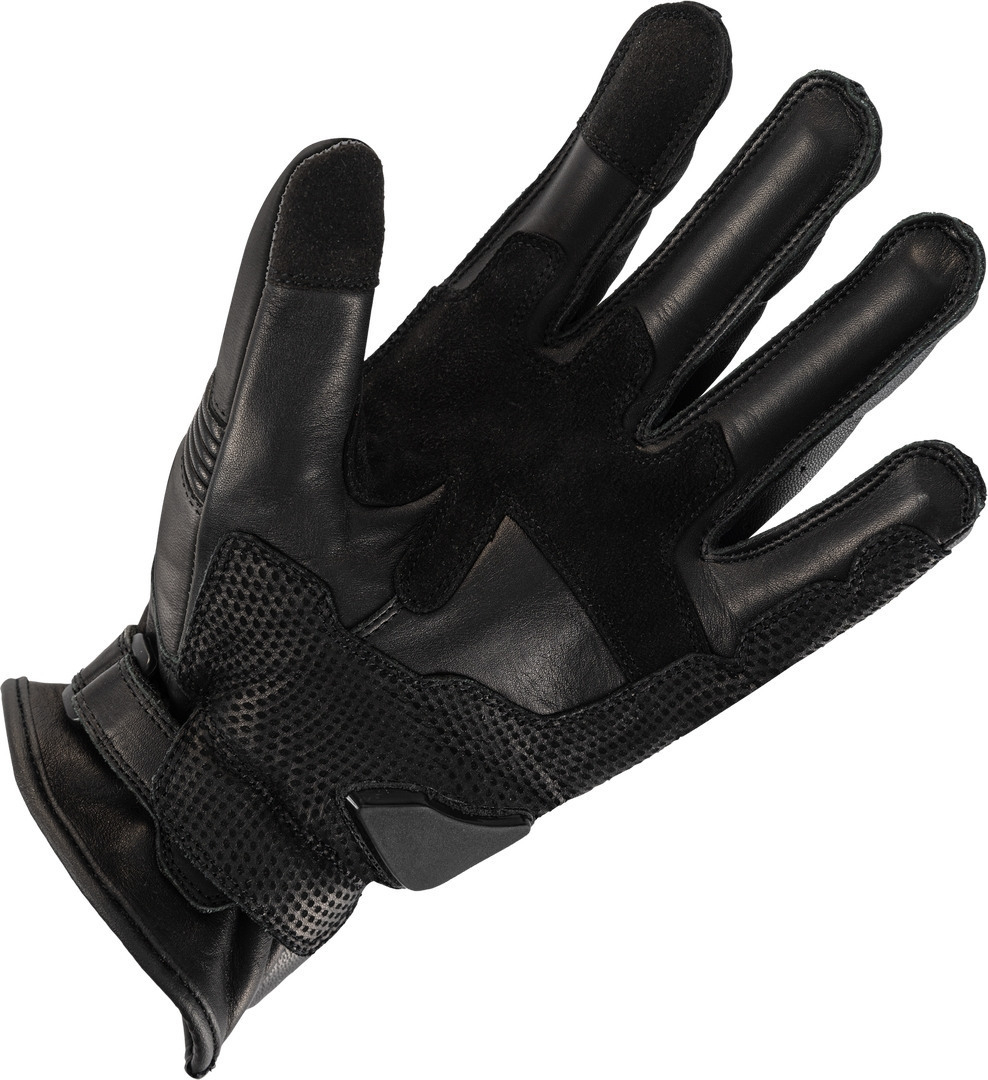 Sporty gloves with long cuffs, carbon hard shell over the knuckles, elastic textile fabric for more mobility, touch screen function and reflective elements.
