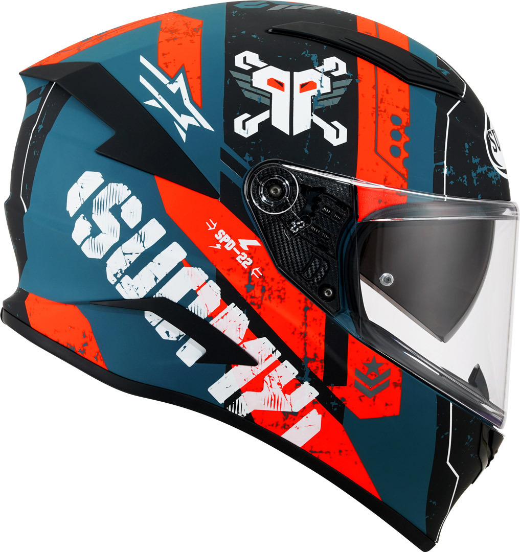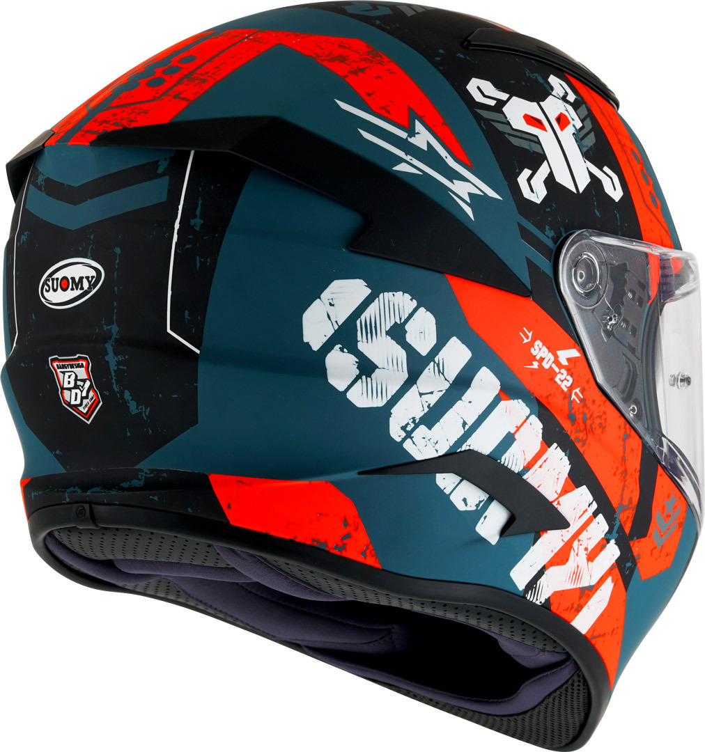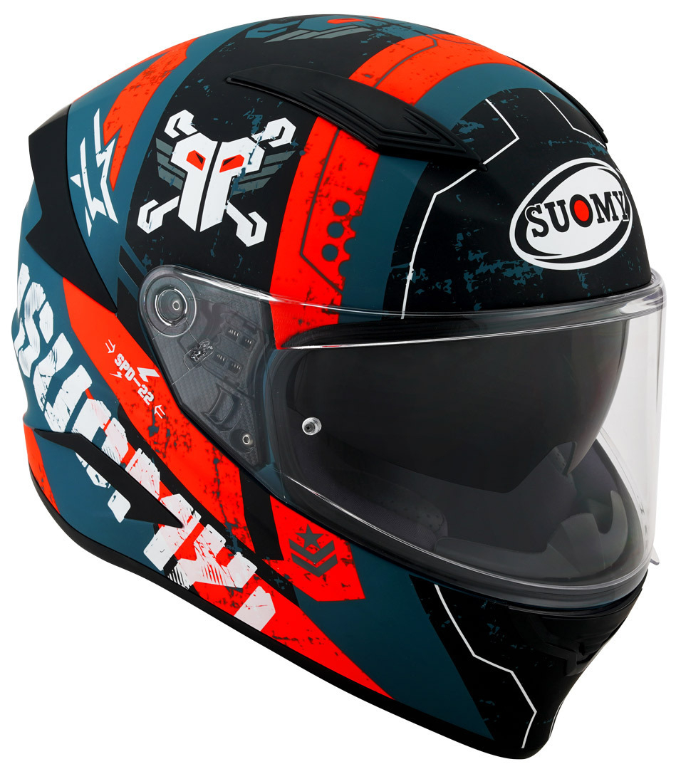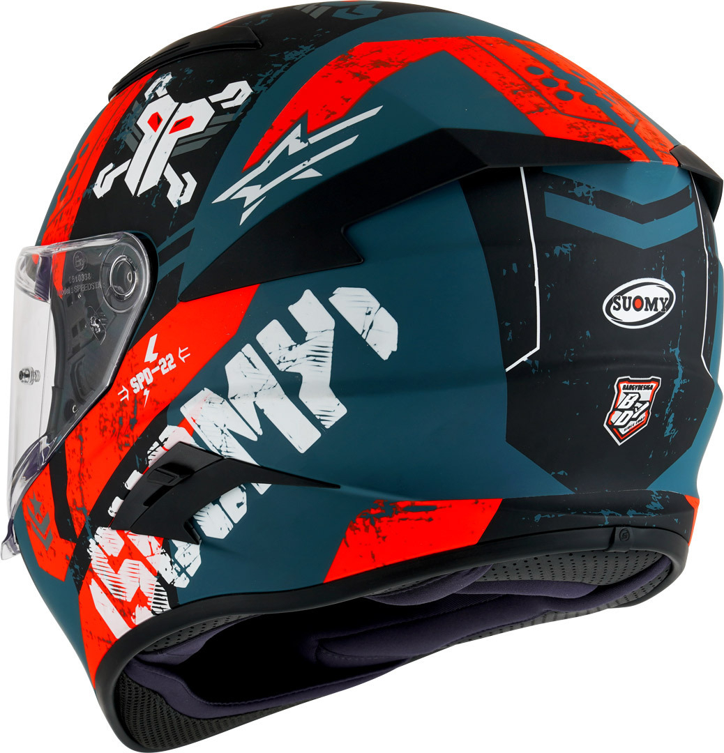 Cu numele ambițios de SPEEDSTAR, Suomy propune, cu casca dn fibră compozită, rezultat al experienței de douăzeci de ani în competiții internaționale, un nou concept de cască de sport - touring. Sesiunile frecvente in tunel de vânt, echivalente cu o cască de curse, au dat naștere unor forme dinamice, un coeficient aerodinamic performant și un echilibru general de invidiat. Departamentul Design, R&D și Riding Test au creat pentru SPEEDSTAR un pachet de soluții care îmbogățesc confortul și versatilitatea. Noua viziera de Clasa 1 injectie cu grosime variabila, cu Pinlock Max Vision, garanteaza vizibilitatea in diferitele unghiuri de rulare; parasolarul mare se extinde pe părțile laterale ale pernelor oferind adăpost complet de lumina soarelui.