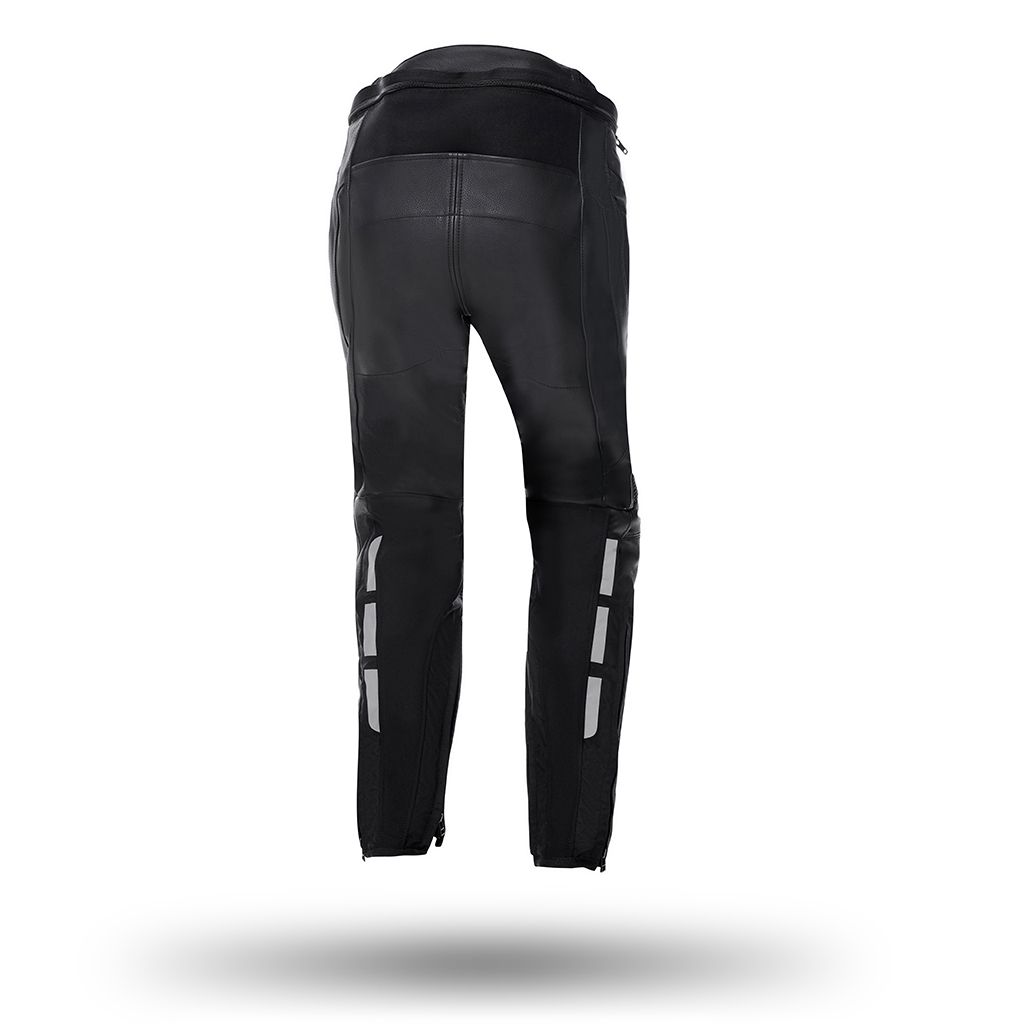 Piele de vacă de 0,9/1,0 mm. Interior - căptușeală fixă din poli-plasă. Protectoare de genunchi CE omologate conform PN EN 1621-1:2012. Toate zonele de cusătură cu construcție cu cusături de siguranță conform standardului EN 17092:2020. Construcție dinamică fără sudură pe zonele de frecare de pe pantaloni și căptușeală interioară. Căptușeli laterale care absorb șocuri. Zone flexibile pe talie și genunchi. Țesătură X-STRETCH de înaltă rezistență pe zona picioarelor, coapselor, gambelor și inghinelor. Inserții din material de înaltă rezistență pentru un confort mai bun. Sistem de conectare cu fermoar în talie la jachetă. Închidere de jos cu fermoar dublu pentru a purta pantalonul atât în interiorul, cât și în exteriorul cizmei.