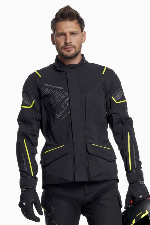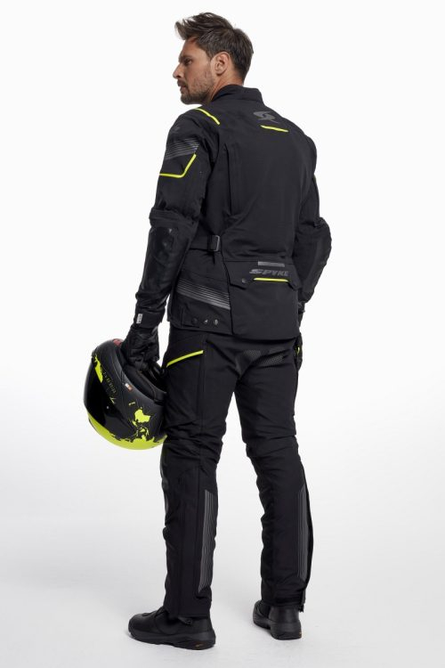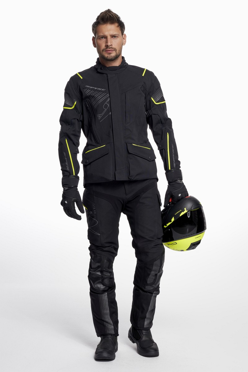 Pantaloni 2 in 1. Carcasă exterioară: 89% nailon + 11% spandex PD/WR/PU laminat (10k/10k). Căptușeală: plasă poli + plasa 3d Căptușeală termică interioară detașabilă. 100% Poliester Protectoare de genunchi CE omologate conform PN EN 1621-1:2012. Buzunare șolduri pentru protecții de șold certificate. Toate zonele de cusătură cu construcție cu cusături de siguranță conform standardului EN 17092:2020. Buzunare frontale false pentru ventilație. Talie reglabilă cu curea și velcro. Reglarea piciorului de jos cu fermoar și velcro. Zone reflectorizante în față și spate, reflectorizant în conformitate cu standardul EN 20471. Butoane cu sigla SPYKE. 2 buzunare frontale impermeabile funcționale. Fermoar scurt și spate și catarame în față pentru bretele. Prindere anti-alunecare la scaun. Căptușeală termică interioară detașabilă. Toate cusăturile exterioare sunt sigilate. Toate fermoarele exterioare sunt impermeabile. Fermoar de conectare.