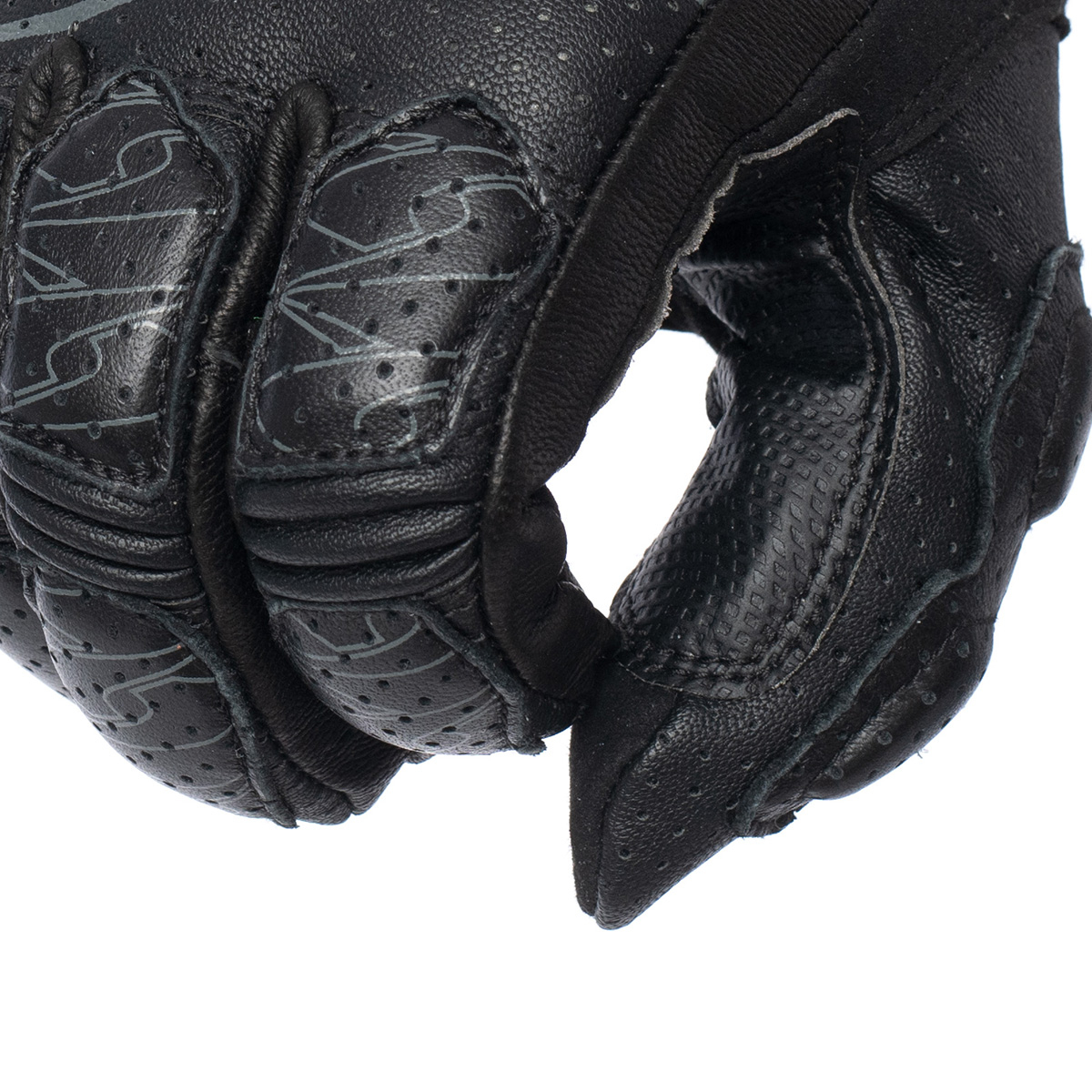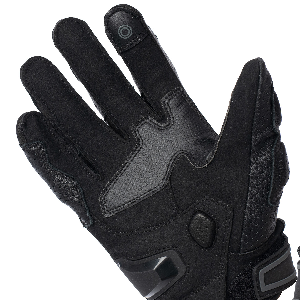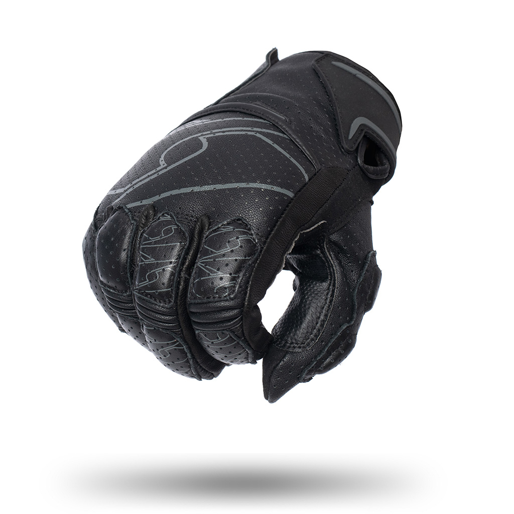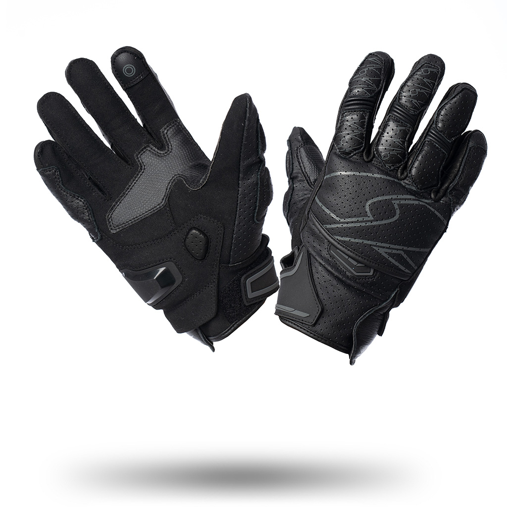 Short racing Leather glove with perforations for air ventilations. Micro fiber + tricot laminated palm. Leather reinforcement at palmfor protection. Back hand printing area fromcow nappa leather. Goat leather in fourchette. TPR logos at wrist with velcro. Touch phone compatible.