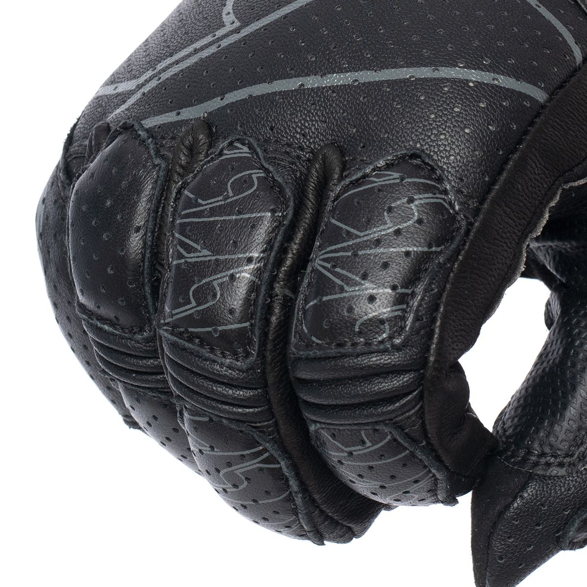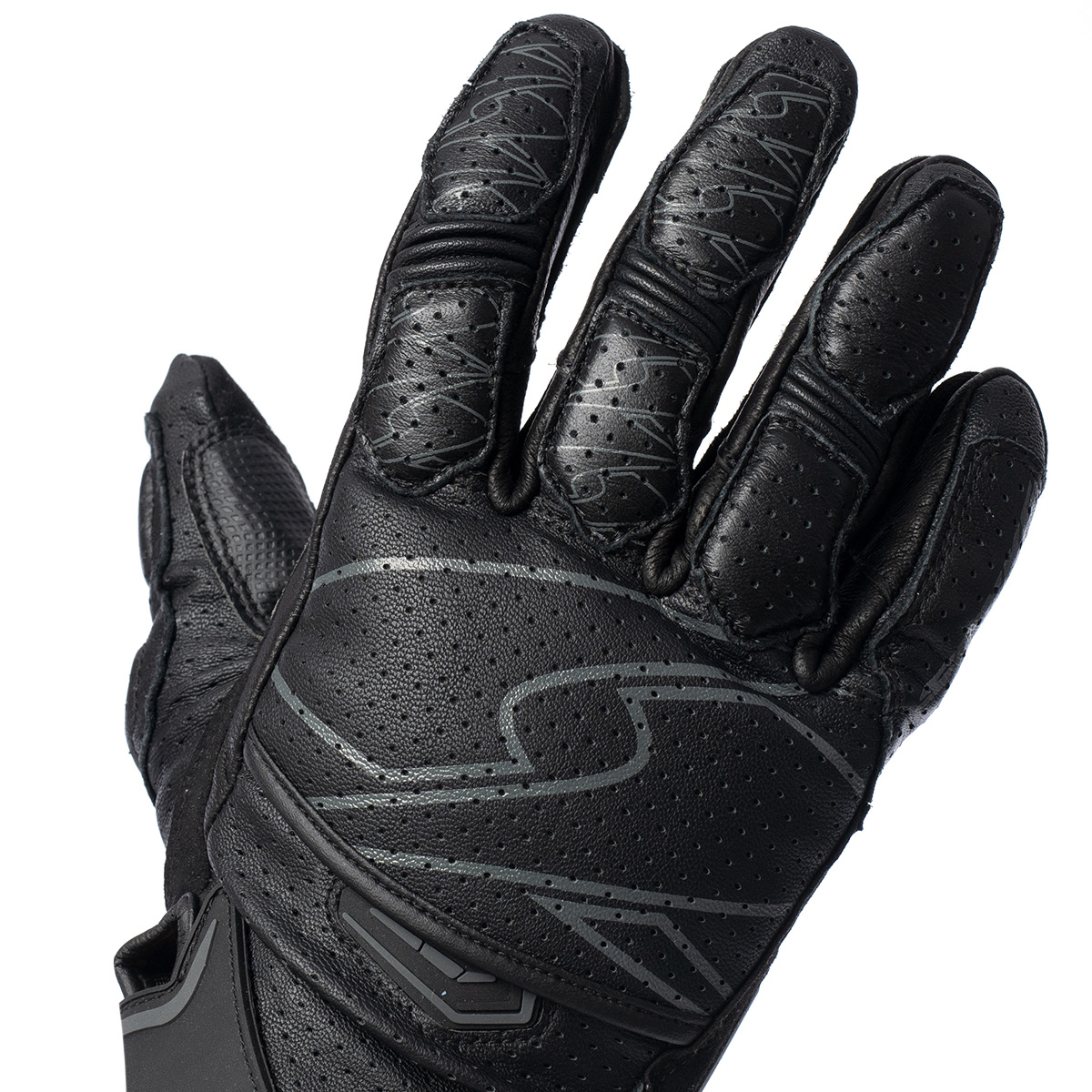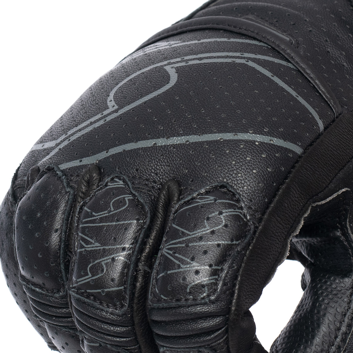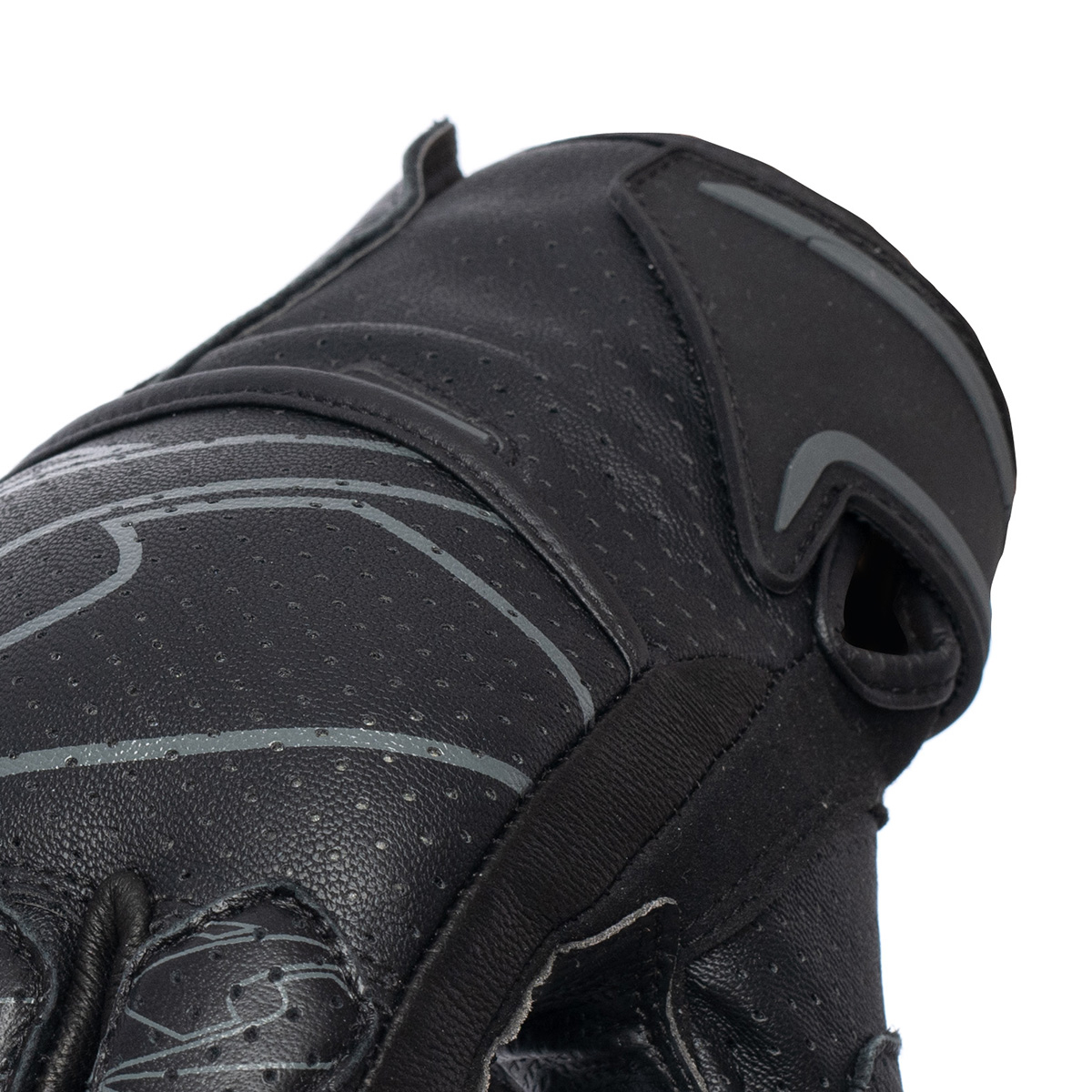 Short racing Leather glove with perforations for air ventilations. Micro fiber + tricot laminated palm. Leather reinforcement at palmfor protection. Back hand printing area fromcow nappa leather. Goat leather in fourchette. TPR logos at wrist with velcro. Touch phone compatible.